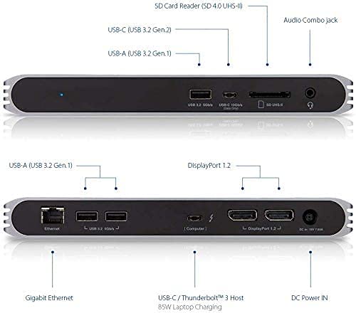 [10 PORTS OF CONNECTIVITY]: 1 x Thunderbolt 3 (retrocompatibile con USB-C), 2 x DisplayPort 1.2, 3 x USB 3.2 Tipo A (5Gb / s), 1 x USB-C 3.2 Gen 2 (dati 10Gb / s Solo), Gigabit Ethernet, slot per schede SD UHS-II (SD 4.0), jack audio combinato da 3,5 mm. ** USB-C Pro Dock non ha una porta Thunderbolt 3 a valle