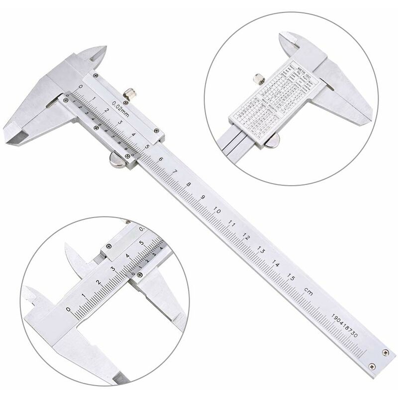Materiale del righello: acciaio 3 modi per misurare il calibro: interno, esterno e profondità Precisione del calibro: ±0,02 mmIl prodotto contiene un calibro a corsoio, un righello e un panno per la pulizia