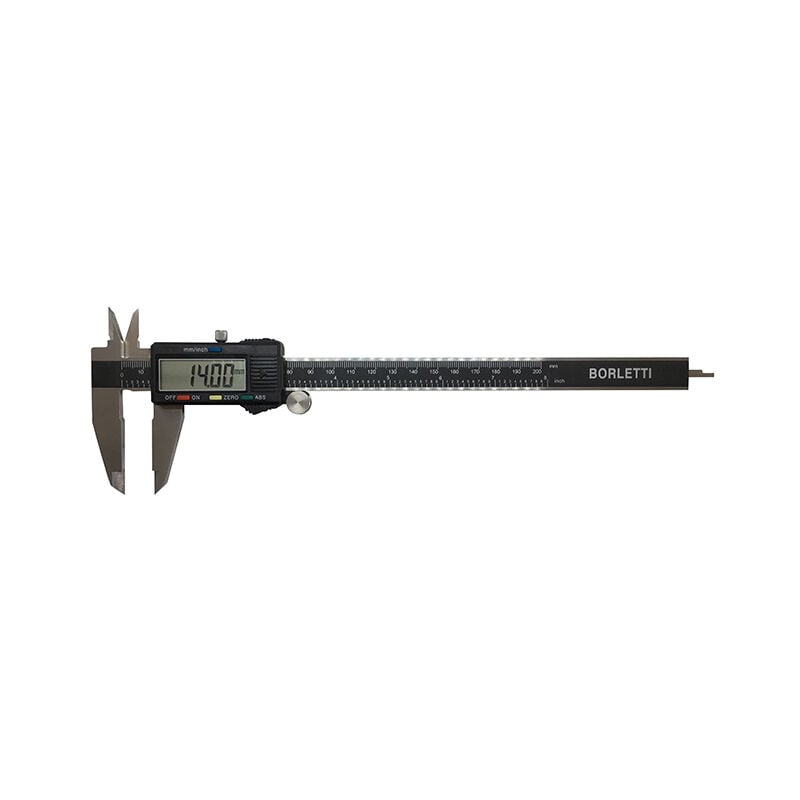 Il calibro BORLETTI è realizzato in acciaio INOX, con display di chiara lettura numeri alti 12 mm, ed una velocità di scorrimento superiore a 1 m/sec. Dotato di rullo di regolazione e bloccaggio nonio superiore a vite. Costruiti secondo direttive CE. Con astuccio di protezione. Caratteristiche tecniche del calibro BORLETTI CDJAAB20 Campo di misura: 200 mm Risoluzione nonio: 0,01 mm Precisione nonio: 0,03 mm Ingombro: 285 mm Becchi esterni: 50 mm Becchi interni: 19 mm ON/OFF ABS/INC mm/inch Azzeramento Batteria SR44-1x1,5V Precisione secondo: Norme DIN 862 Garanzia: 24 mesi