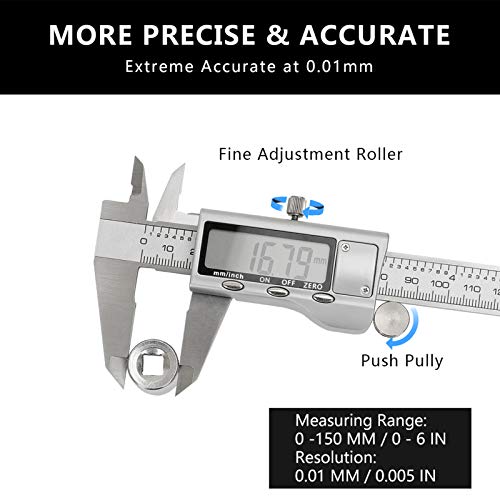 【Alta Precisione e Misurazione Multifunzionale】 REEXBON Digital caliper si permette sia la misurazione in millimetri che a pollici, la misurazione da 0 a 6 pollici / 150 mm, precisione: ± 0,03 mm, risoluzione: 0,01 mm / 0.0005 pollici. Con misure molto accurate e precise su lunghezza, diametro, spaziatura e profondità.