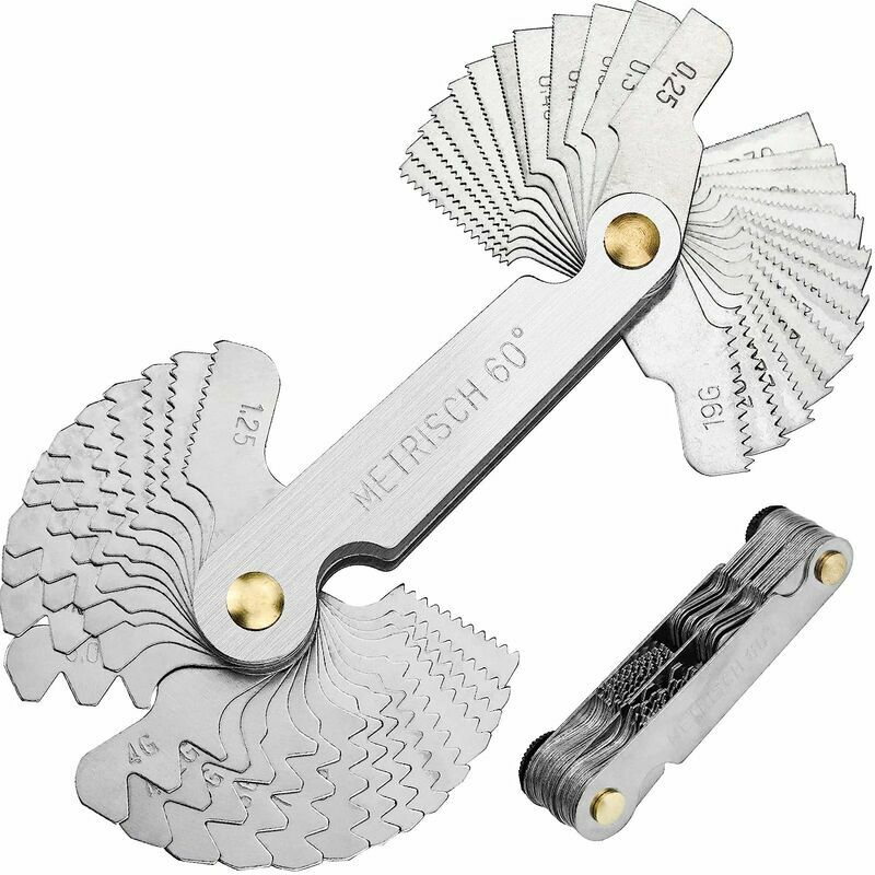 DIMENSIONI - : Metrico (mm) 60°+Whitworth-55°, Calibro filettatura [Quantità]: Metrico (mm) 60° Calibro passo filettatura, 24 pz. Whitworth-55°, 28 gag al centro della lama [Misurazione accurata]: il bordo seghettato è chiaramente contrassegnato. I numeri sono precisi e di facile lettura.[Utilizzo]: viene generalmente utilizzato per verificare la dimensione e il passo corretti delle filettature interne ed esterne e per rettificare e posizionare la filettatrice sul tornio. [Facile da uso]: c'è un design del foro su entrambe le estremità del calibro del filo, che può essere regolato liberamente dalla posizione in cui si preme il calibro del dente e la lama del filo può essere facilmente ruotata.