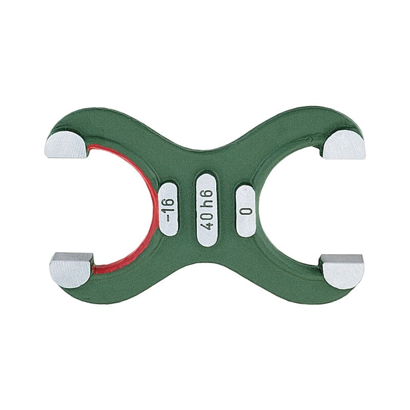 9 Dimensione nominale: 73 mm Calibro a forcella differenziale in acciaio per calibri di prima qualità temprato, sottoposto a distensione, rettificato e lappato. Lato passa con sovrametallo di usura a norma DIN 7163. Per campi di tolleranza ISO a − zc nei gradi di tolleranza base 6 − 13. Uso: Per controllare gli alberi negli accoppiamenti con gioco, intermedi o a interferenza. Norma: Toleranzen und Abmaße nach DIN EN ISO 1938-1 und DIN 7163. Nota: Definire la classe di tolleranza desiderata. Al momento dell'ordine indicare il campo di tolleranza (a − zc) e il grado di tolleranza base (6 − 13), ad es. n. art. 484222 Dim. 10f9. Calibri per grado di tolleranza base 5 e tolleranze più strette disponibili su richiesta. Dati tecnici Taratura L8 Attributo del nome del prodotto a − zc Tipo di prodotto Calibro a
