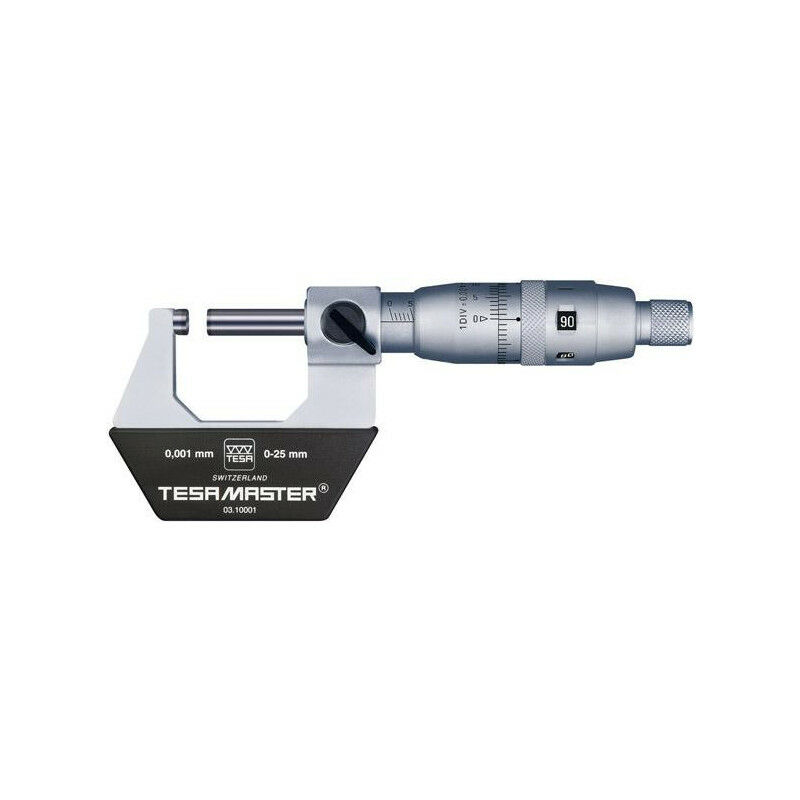 Micrometro TESAMASTER - DIN 863 - Bloccaggio mediante leva di serraggio - Superfici di misura con punta in metallo duro - Visualizzazione senza parallasse dei millesimi di millimetro mediante un indice - Visualizzazione della scala con millimetro. Centesimi e decimi di millimetro come valore numerico - Isolamento termico della mano - Controllo della forza di misura mediante cricchetto di tastatura Consegna: con rapporto di prova. in valigetta di plastica.