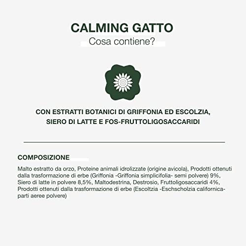Formulato con estratti botanici di Griffonia ed Escolzia, favorisce un fisiologico rilassamento. Con siero di latte, fonte naturale di proteine dall'azione rilassante, con FOS-Fruttoligosaccaridi ad azione prebiotica che aumenta il transito intestinale favorendo l'eliminazione/espulsione dei boli di pelo.