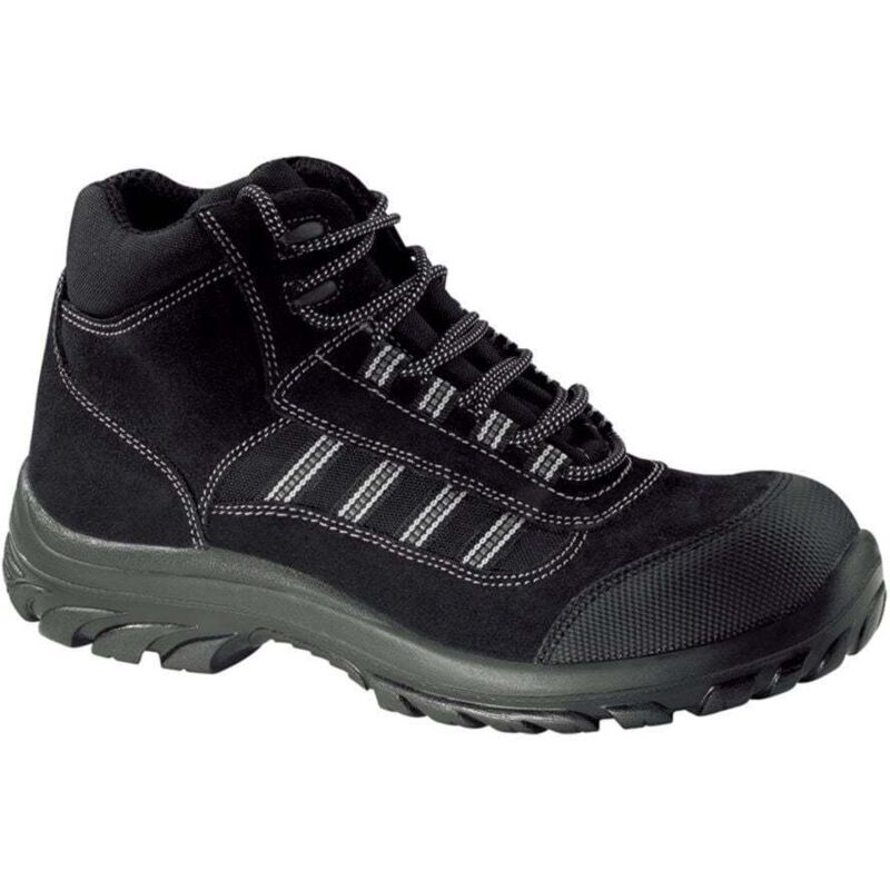 Calotta in policarbonato resistente a 200 joule Calzature Resistenza Elettrica-Antistatiche Assorbimento di energia attraverso il tallone Resistenza della suola agli idrocarburi Resistenza della suola alla perforazione Resistenza della tomaia alla penetrazione e all'assorbimento dell'acqua Suola antiscivolo SRC Scarpe 100% non metalliche Caratteristiche: Peso per paio taglia 42: 1300 g Stelo: Crosta di pelle idrorepellente con finitura in velluto nero con inserti in tessuto e bande retroriflettenti Chiusura: passanti in tessuto retroriflettenti Fodera quarto: tessuto microaerato tridimensionale altamente traspirante Fodera avampiede: sintetico Vestibilità: Natur'form (grande) Raccordo: California Sottopiede: tessuto Sottopiede: schiuma e tessuto Composizione: Crosta di pelle idrorepellente con finitura in velluto nero Sintetico Protezioni: Puntale: policarbonato (200 joule) Inserto antiperforazione: tessuto composito ad alta tenacità penetrazione 0 (1100 Newton) Standard: EN ISO 20345
