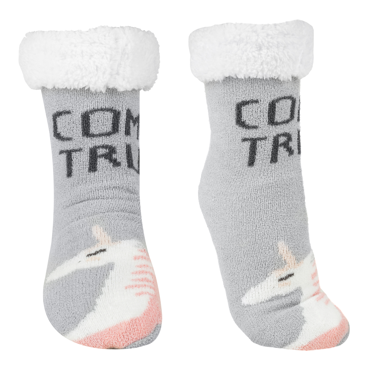 Caldi calzettoni antiscivolo da donna con tessuto a maglia fluffy decorato con simpatico unicorno, foderato in pile termico effetto peluche e suola antiscivolo. Super morbidi e confortevoli mantengono i piedi caldi durante le giornate più fredde e sono ideali anche da regalare a parenti o amiche. Elasticizzati, a collo alto e taglia unica, si adattano a qualsiasi calzata. Lavabili in lavatrice a 30° senza centrifuga, si consiglia di non asciugare in tamburo e non stirare.