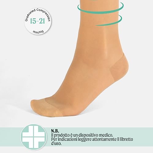 PACK: disponibili in pack da 1 o da 2 paia | DENARATURA 140 | Compressione graduata > 15-21 mm/Hg | PUNTA RINFORZATA: un'area rinforzata in punta che riduce il rischio di smagliature e allunga la durata del prodotto. | TALLONE RINFORZATO: la parte del tallone rinforzata per un posizionamento corretto, oltre a una migliore vestibilità dona una grande elasticità nella parte della caviglia. | COLORI DISPONIBILI: Beige, Nero | TAGLIE DISPONIBILI: S/M, L/XL
