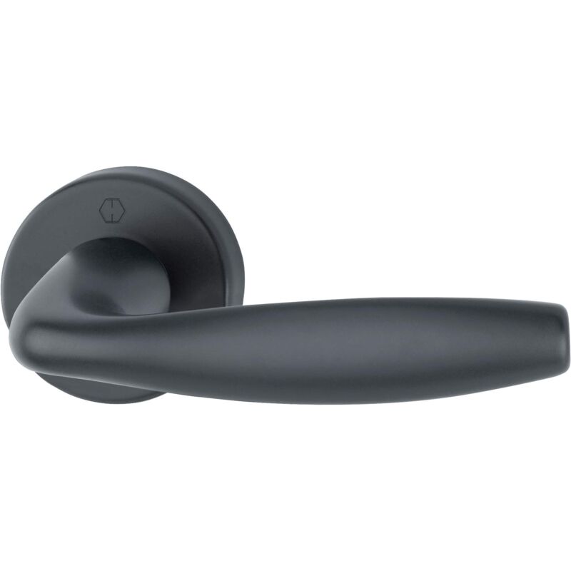 Descrizione Set maniglie per porte interne con molla di recupero, utilizzabile a destra e sinistra, rosetta rotonda, realizzata con base interna in nylon e corpo in alluminio nero opaco. Fissaggio della rosetta non visibile tramite viti multiuso. Fissaggio della maniglia tramite sistema a sgancio rapido da 8 mm. Conforme alla norma DIN EN 1906:37-0140a.