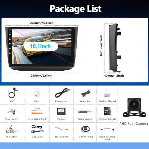Altre specifiche: 1) Autoradio con telecamera posteriore AHD con ampio angolo di visione, alto coefficiente di impermeabilità e visione notturna, per ottenere un'immagine chiara in qualsiasi ambiente. 2) Supporta OBD2 esterno, DAB+, controllo vocale, subwoofer, ecc. 3) Supporta la funzione split screen, come la navigazione e la riproduzione di musica allo stesso tempo.