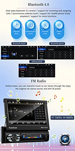 Autoradio Bluetooth con radio FM. Funzione Bluetooth integrata, può essere collegata ai telefoni cellulari, ricarica automatica della rubrica, chiamate in vivavoce, guida più sicura, musica Bluetooth. Con la radio FM, è possibile ascoltare le condizioni stradali, le notizie, le previsioni del tempo, ecc. con 18 stazioni radio preimpostate (FM 87,5-108).