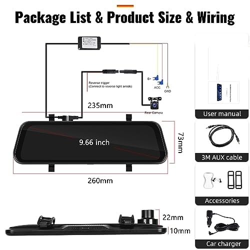 【9,66 pollici HD 1080P Mirror Dash Cam Full Touch Screen】 9,66 pollici Mirror Smart Screen Dash Cam adottato con HD 1280 x 320 IPS Full Touch Screen. Eseguire le varie operazioni della dashcam con un semplice tocco: commutare le immagini della telecamera anteriore e posteriore facendo scorrere a sinistra e a destra, regolare l'angolo di visione facendo scorrere verso l'alto e verso il basso, registrazione/riproduzione video, regolazione dell'esposizione e altro ancora.