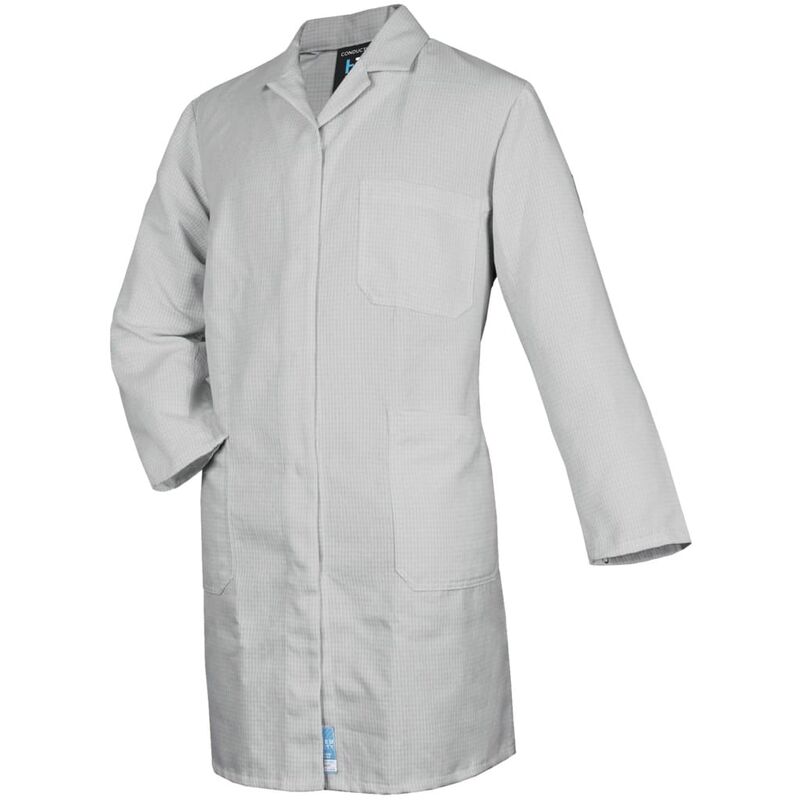 Impiego: Produzione elettronica. Per la protezione dei prodotti dalle scariche elettrostatiche. Resistenza superficiale: da 106 a 107 Ω. Camice ESD in materiale CONDUCTEX® comodo e leggero. Il tessuto misto si contraddistingue per gli ottimi valori di dispersione e il comfort elevato. Alta traspirabilità, testata dall'Hohenstein Institute. Senza cuciture laterali. * Colletto con risvolto e chiusura con bottoni a pressione nascosti su un lato. * Tasche laterali applicate con accesso diagonale. * Tasca pettorale. * Orlo delle maniche regolabile con bottone a pressione. * Adesivo con logo ESD sul braccio sinistro. Norma: EN 61340-5-1. Dati tecnici Colore grigio argento Tipo di prodotto Camice Proprietà elettrostatiche EGB/ESD Grammatura del materiale / spessore del tessuto g/m2 130 Serie CONDUCTEX® Genere da uomo Norma/regolamento EN 61340-5-1 Taglia unisex 2XL Chiusura giacca Pulsante Chiusura nascosta sì Traspirante sì Antistatico sì