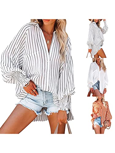 Camicia da Donna Camicia a Maniche Lunghe con Bottoni Camicia Ampia Tinta Unita/Righe Camicetta Elegante Top Casual Grande per Primavera Autunno (White, X-Large)
