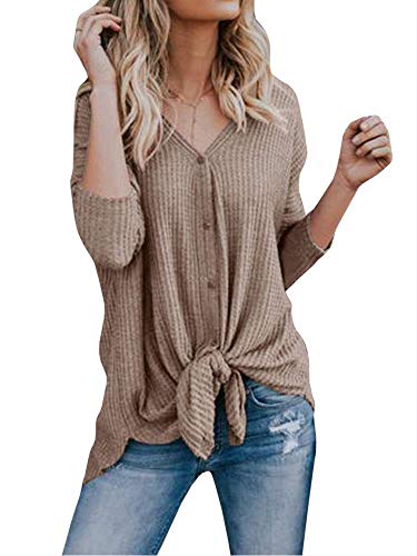 Caratteristiche: camicia Henley con bottoni, maniche lunghe, scollo a V, materiale a coste, tinta unita/solida, carina, alta bassa, nodo anteriore a maglia intrecciata, vestibilità casual allentata, pullover top, camicie a tunica