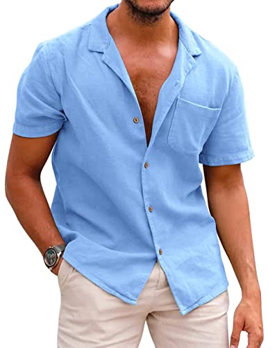 Camicia in Lino da Uomo Camicie in Lino di Cotone a Maniche Corte con Risvolto Taschino Casual Tinta Unita Casual Azzurro M