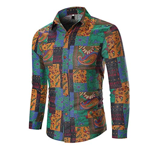 Camicia da Uomo Etnica Stampata a Maniche Lunghe, Camicia da Uomo a Maniche Lunghe, in Lino Stampato, Fantasia Floreale, Stile Casual, con Bottoni, Camicia Hawaiana a Maniche Lunghe Green XL