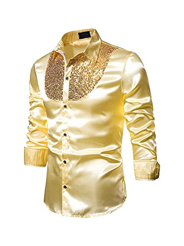 Camicia da uomo con paillettes lucide Abito da uomo di lusso Paisley Slim Fit Button Down Camicia da discoteca anni '90, Oro-A., XL