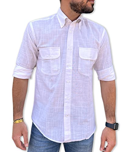 CAMICIE & dintorni Camicia Doppio Taschino Cotone TG. S, M, L, XL, XXL, 3XL Effetto Lino Uomo Button Down (S, Bianco)