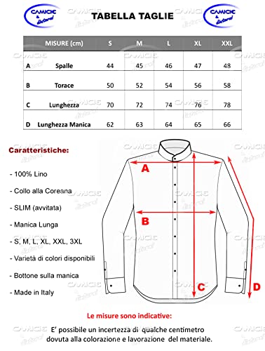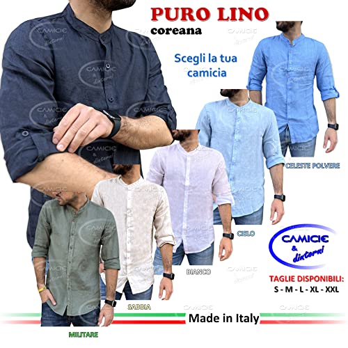 STILE CASUAL: Bottone sulla manica con possibilità di girarla e abbottonarla con laccio. Camicia 100% Lino - modello SLIM (avvitata) - COLLETTO ALLA COREANA Manica Lunga, ideale da abbinare a un paio di jeans o pantaloni chino, per il lavoro, il tempo libero o appuntamenti serali, ecc. Il colletto alla coreana gli da un tocco più moderno. La camicia è Made in Italy