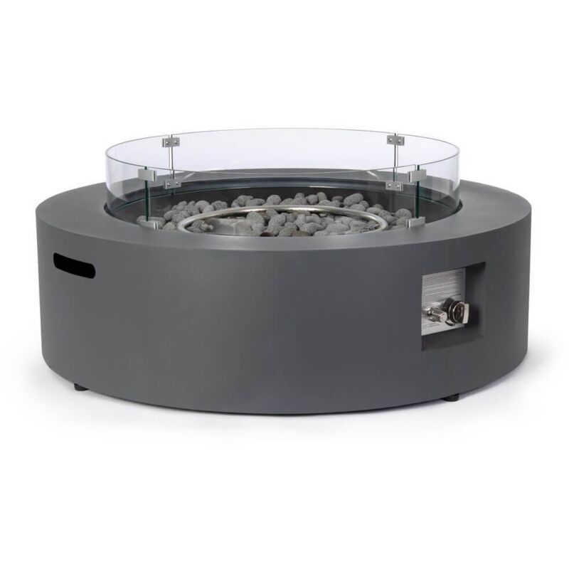 Struttura in acciaio verniciato (spessore 0,8 mm). paravento per camino in vetro (spessore 5 mm), vetro removibile. misure vetro ø74 x 14 cm. bruciatore: ø45 cm. provvisto di coperchio in acciaio verniciato per coprire l'articolo quando non e' in uso. completo di sassi decorativi in roccia lavica colore grigio scuro. provvisto di copertura in telo nero per coprire l'intero articolo quando non e' in uso. gas di alimentazione butano o propano, funziona con bombola da kg 5 (non inclusa). alloggio per bombola non previsto, completabile con mobile contenitore bombola codice 0782468. con manopola di regolazione. accensione a batteria, batteria non inclusa. prodotto destinato solo per uso domestico ed esterno. prodotto non destinato ad