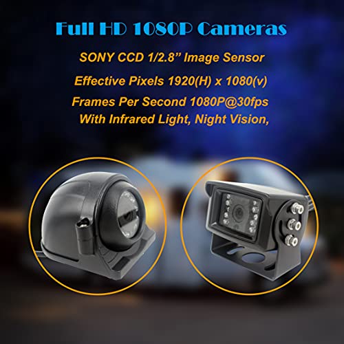 【Eccellente qualità video Full HD】 Sensore di immagine 1080P 1 / 2,8" 1080P. Sia la telecamera per la visione posteriore che la telecamera per la visione laterale sono utilizzate in un robusto guscio metallico, il grado di impermeabilità è IP69. Risoluzione: PAL: 1920 (H) * 1080 (V).La frequenza dei fotogrammi è 1080P@30fps.Temperatura di esercizio:-20~70℃.Distanza di visione notturna IR fino a 12 metri.