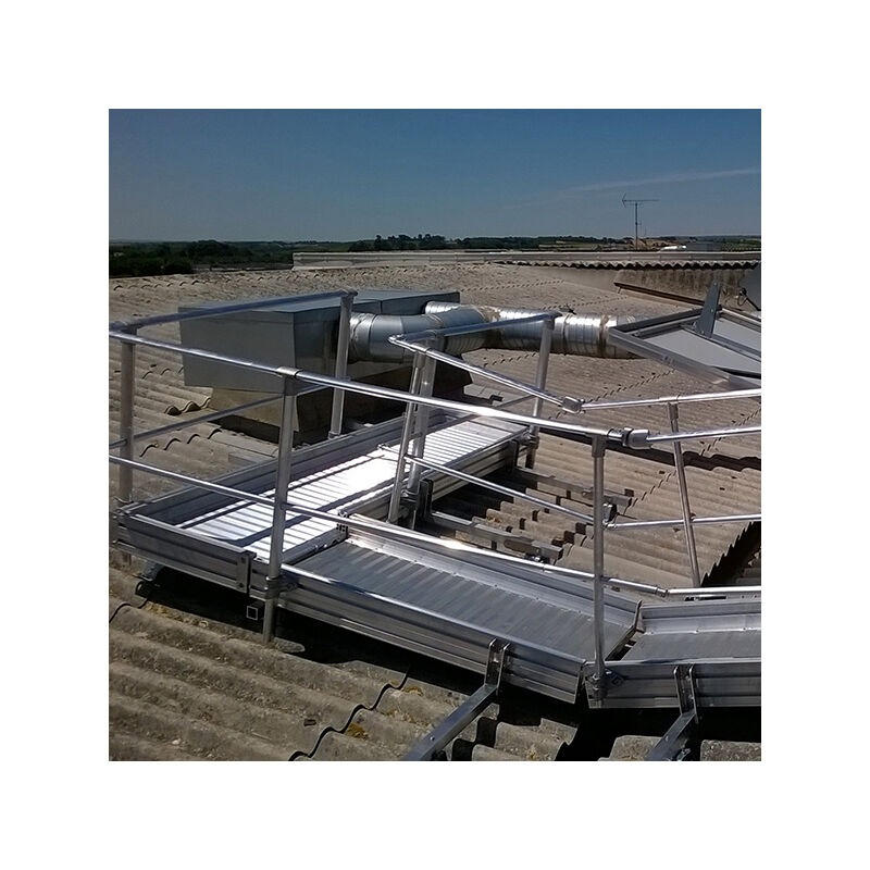 CIRCOLAZIONE SUL TETTO - Camminatoio per un accesso sicuro ai tetti - Evitare il rischio di cadute dall'alto negli edifici agricoli - Sistema di protezione collettiva per il controllo, la manutenzione e la riparazione dei sistemi di ventilazione. - Manutenzione regolare del tetto di un edificio industriale per prevenire problemi di impermeabilizzazione. - Attrezzature per un uso permanente, intensivo e regolare. PERPENDICOLARE AL TETTO - Binario per tetto che corre perpendicolarmente alla pendenza. - Installazione per lo scorrimento lungo il tetto. - Per tetti con inclinazione da 5 a 25°. SICUREZZA - Pista per tetti dotata di doppio parapetto per una sicurezza ottimale. - Consente l'utilizzo della corsia di marcia senza sistemi di sicurezza aggiuntivi. - Ampia (0.80m) per una circolazione senza ostacoli delle attrezzature. FISSAGGIO - Sostituisce i fissaggi delle piastre in fibra. - Fissaggi da installare ogni 3.00m al massimo. SU RICHIESTA - Pista sul tetto di lunghezza superiore a