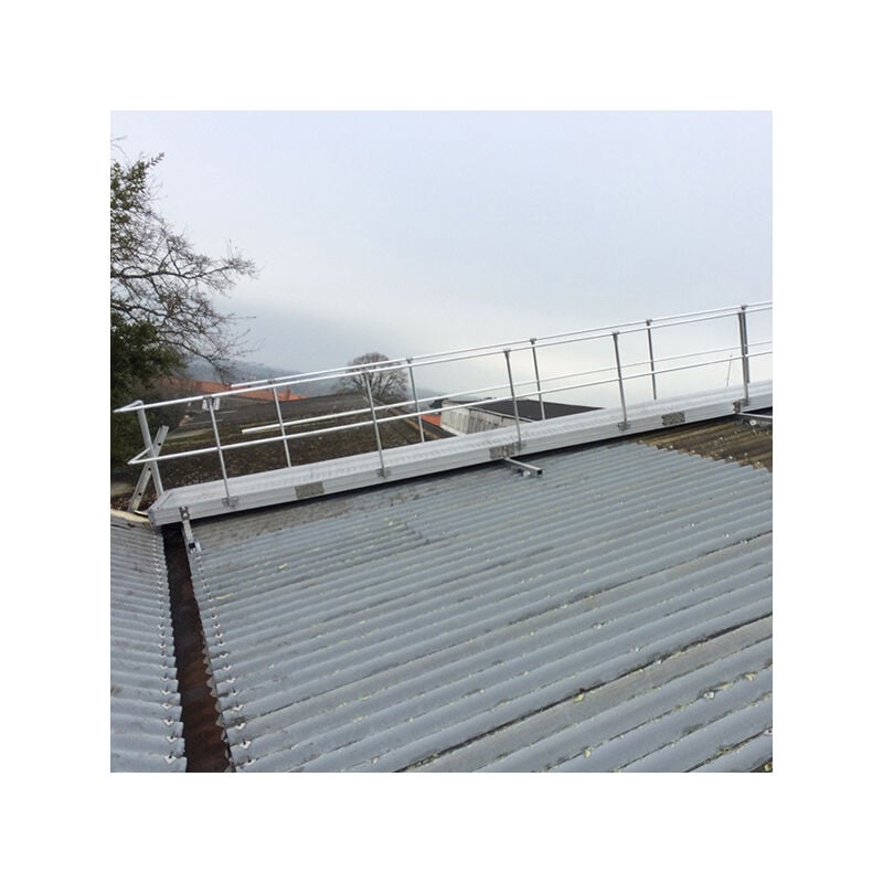 CIRCOLAZIONE SUL TETTO - Camminatoio per un accesso sicuro ai tetti - Evitare il rischio di cadute dall'alto negli edifici agricoli - Sistema di protezione collettiva per il controllo, la manutenzione e la riparazione dei sistemi di ventilazione. - Manutenzione regolare del tetto di un edificio industriale per prevenire problemi di impermeabilizzazione. - Attrezzature per un uso permanente, intensivo e regolare. TETTO CON PENDENZA DI 20 - Traccia per tetti con una pendenza massima di 20°. - L'attrezzatura viene installata nella direzione della pendenza, in modo da poter scavalcare un tetto in tutta sicurezza. SICUREZZA - Pista per tetti dotata di doppio parapetto per una sicurezza ottimale. - Consente di utilizzare la corsia di marcia senza bisogno di un sistema di sicurezza aggiuntivo. - Ampia (0.80 m) per una movimentazione senza ostacoli delle attrezzature. FISSAGGIO - Sostituisce i fissaggi delle piastre in fibra. - Fissaggi da installare ogni 3.00 m al massimo. SU RICHIESTA