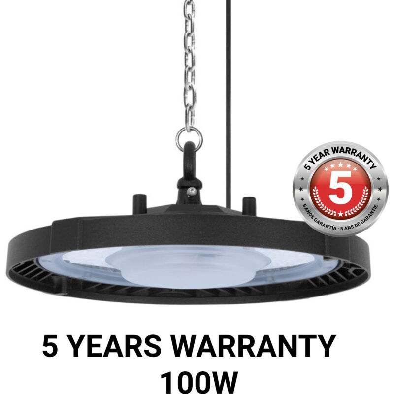 Campana LED con una potenza di 100W e un'efficienza di 100 lm/W. Offre una luce di alta qualità con un CRI>80 e un angolo di apertura di 100°, perfetto per illuminare grandi spazi come aree di stoccaggio e depositi. Dispone di protezione IP65 per uso all'aperto e in ambienti esigenti, supportando un uso continuo massimo di 4-5 ore al giorno. Disponibile in bianco neutro (4000K) e bianco freddo (6000K). Il prezzo competitivo garantisce un eccellente ritorno sull'investimento.