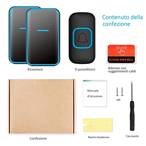36 SUONERIE E INDICATORE LED: Il campanello (trasmettitore) e ricevitori hanno indicatori LED, se qualcuno spinge il campanello, i tre dispositivi lampeggiano tutti con luce blu. 36 suonerie disponibile, 4 volume regolabile da 25 dB a 85 dB.