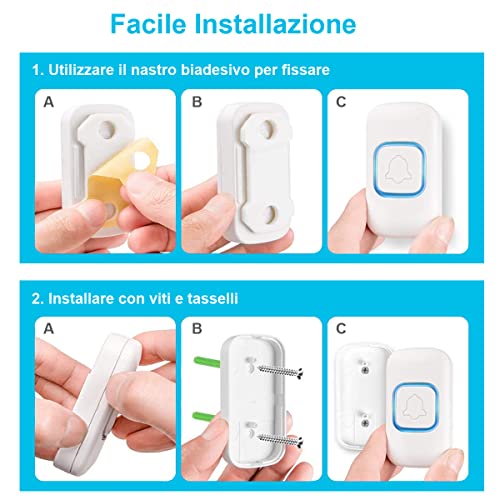 SUPER FACILE INSTALLAZIONE: Il ricevitore non richiede alcun montaggio o batterie, basta solo collegare con una presa elettrica. Il trasmettitore può essere fissato alla porta anteriore con le viti incluso oppure incollalto alla porta con l'adesivo incluso.