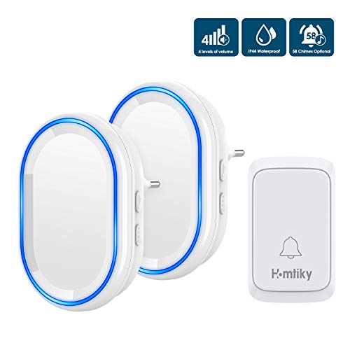 Campanello Senza Fili da Esterno, Homtiky Campanello Wireless con Raggio d'Azione 300M, 58 Suonerie Impermeabile IP44, Indicatore LED 1 Trasmettitore Pulsante e 2 Ricevitori, 4 Volume (bianca)