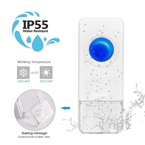 CAMPANELLO PER PORTA IMPERMEABILE ESTERNO IP55 - La classe impermeabile del trasmettitore esterno della campana del negozio è IP55, anello di gomma impermeabile incorporato, anche la pioggia può funzionare normalmente. Può funzionare da -30 ° C a 70 ° C (da -86 ° F a 158 ° F) in grado di resistere alle intemperie. Ottimo per fuori casa, giardino, ufficio, scuola, casa e così via.