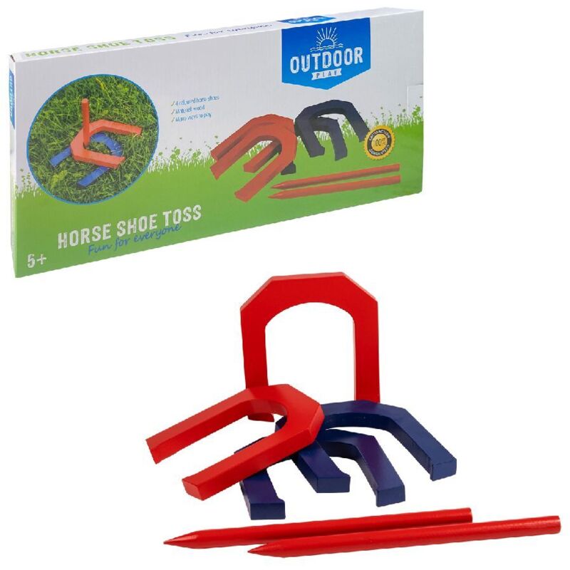 Gioco all'aperto Gioco di lancio del ferro di cavallo. Sconfiggi il tuo avversario lanciando i ferri di cavallo di legno attorno ai pali. Il punteggio più alto vince! Contenuto: 4 ferri di cavallo in legno nei colori blu e rosso e 2 pali in legno alti 30 cm. Materiale: legno. Viene fornito in una scatola a colori. Adatto a bambini dai 5 anni.