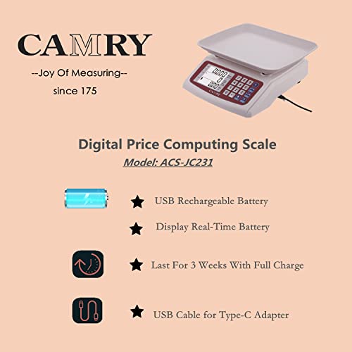 CAMRY Bilancia da cucina,Bilancia commerciale digitale 30kg,batteria ricaricabile USB,Display LCD retroilluminato(Bianco)