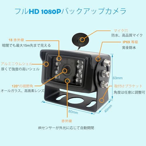 【Eccellente qualità video Full HD】 Sensore di immagine 1080P 1 / 2,8" 1080P. Sia la telecamera per la visione posteriore che la telecamera per la visione laterale sono utilizzate in un robusto guscio metallico, il grado di impermeabilità è IP69. Risoluzione: PAL: 1920 (H) * 1080 (V).La frequenza dei fotogrammi è 1080P@30fps.Temperatura di esercizio:-20~70℃.Distanza di visione notturna IR fino a 12 metri.