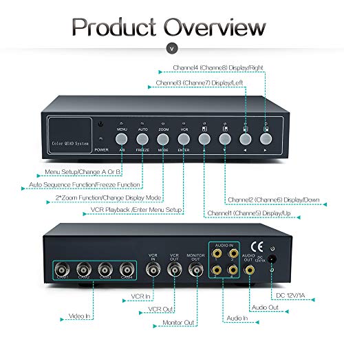 -Supporto allarme di rilevamento del movimento, allarme di perdita video. Nota: questo quad video supporta SOLO telecamere di sicurezza cctv analogiche, non supporta telecamere AHD o IP.