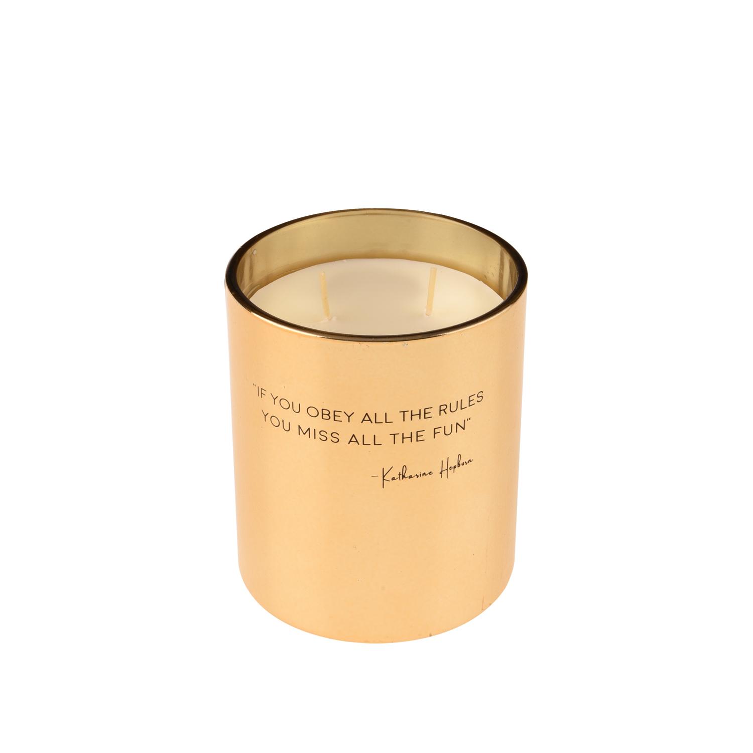 Le candele profumate della linea My Flame Candle sono perfette da regalare ad amici, parenti o colleghi. Il bicchiere che contiene la candela è corredato da una citazione famosa, rendendo un vero e proprio complemento decorativo personalizzato. La candela profumata alla fragranza Silky Tonka diffonde nella stanza essenze piacevoli che rendono l'ambiente accogliente. Il dettaglio in più è dato dalla frase in inglese If you obey all the rules you miss all the fun, citazione della celebre attrice Katharine Hepburn.