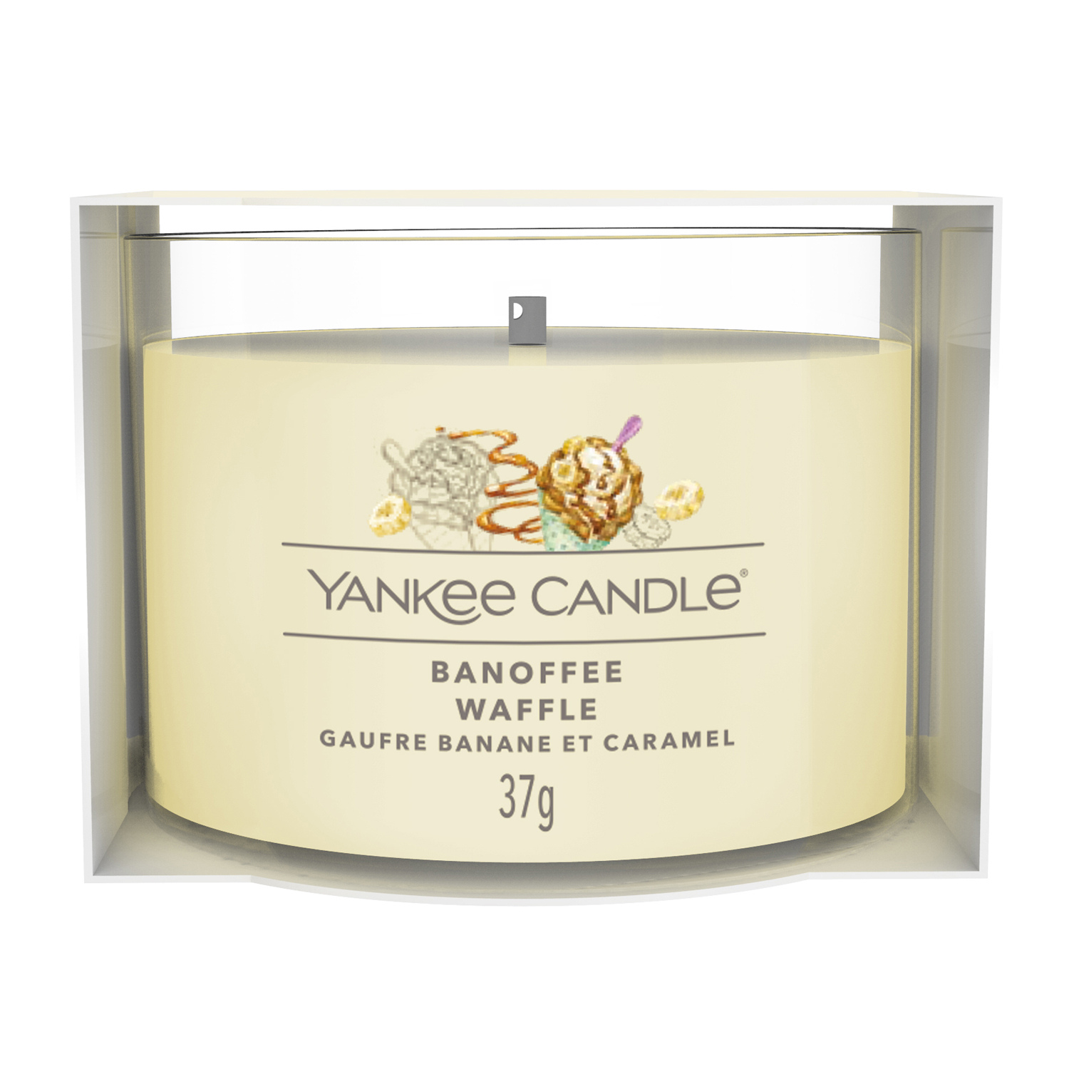 Un aroma di novità avvolgerà la stanza, donando all'ambiente una vitalità inebriante e creando un'atmosfera magica con la luce soffusa di questa candela profumata votiva. Pratica e facile da usare, assicura fino a 10 ore di piacevole profumazione ed è perfetta come idea regalo per offrirti una pausa rilassante. Banoffee Waffle è una fragranza fruttata con note che richiamano un invitante waffle ricoperto di gelato alla banana, con tocchi al profumo di caramello e cioccolato. Note di testa al primo impatto: Crema alla banana, Limonata ghiacciata, Lime. Note di cuore, struttura principale della fragranza: Sorbetto alla banana. Note di fondo che costituiscono la struttura finale: Cioccolato, Vaniglia. La scatola contiene un cero votivo da 37 g in vasetto di vetro.