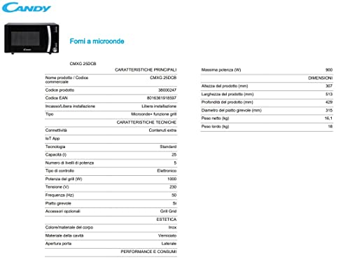 Candy CookinAPP CMXG 25DCB Forno a Microonde con Grill, 900 W, 25 Litri, 40 Programmi Automatici, App hOn, Blocco Bambini, 51,3x42,9x30,7 cm, Inox