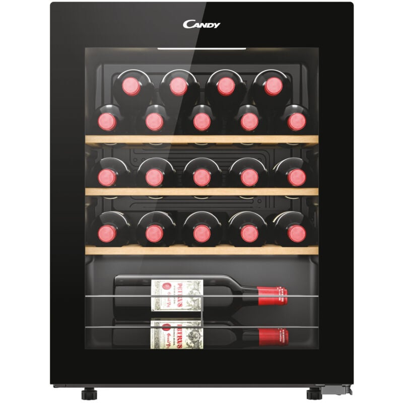 Candy DiVino CWC023. Posizionamento dell'apparecchio: Libera installazione, Colore struttura: Nero, Colore interno: Nero. Capacità bottiglie: 23 bottiglia/bottiglie, Intervallo temperatura (zona 1): 5 - 20 °C, Classe climatica: N-ST. Tipo di controllo: Touch, Tipo di lampada: LED, Applicazioni per il controllo supportate: hOn. Classe efficienza energetica: G, Consumo energetico annuo: 136 kWh, Scala di efficienza energetica: Da A a G. Larghezza: 475 mm, Profondità: 456 mm, Altezza: 630 mm Design Posizionamento dell'apparecchio Libera installazione Colore struttura Nero Colore della porta Nero, Trasparente Colore interno Nero Materiale manico Plastica Materiale della porta Vetro Materiale ripiano Legno Numero di ripiani 3 ripiani Numero di porte 1 porta/porte Cerniera porta Destra Porte reversibili Sì Protezione dai raggi ultravioletti (UV) Sì Tipo di vetro Anti UV Prestazione Capacità bottiglie 23 bottiglia/bottiglie Numero di zone temperatura 1 Intervallo temperatura (zona 1) 5 - 20