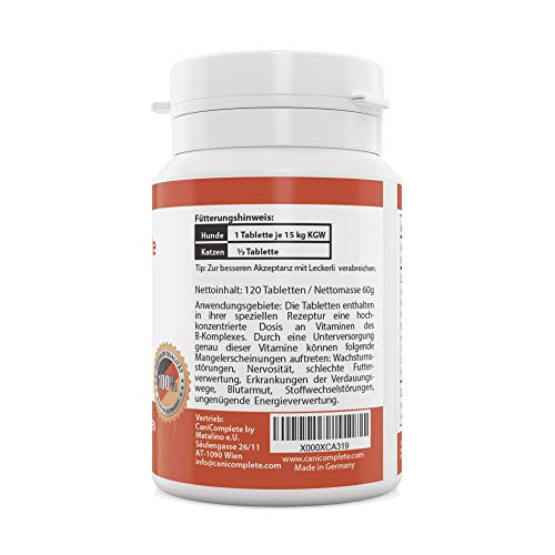 CaniComplete Complesso vitaminico B per Cani, Gatti, B1, B2, B3, B5, B6, B9, B12, K3, Calcio, Acido folico. Supporta funzioni nervose Importanti. 120 Pezzi (Confezione 4 Mesi)