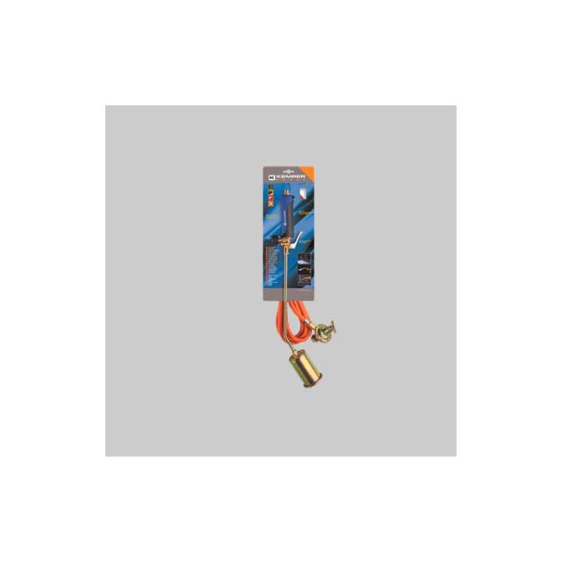 Impugnatura ergonomica con rubinetto di regolazione e leva economizzatore, bruciatore in ferro con aspirazione laterale ad alto potere calorifico. Funzionamento con gas GPL. Ideale per lavori di impermeabilizzazione, bitumazione, scongelamento tubi, saldatura di lamine, disinfestazione di insetti, pirodiserbo. Composta da: cannello completo, tubo gomma raccordato, regolatore alta pressione. Cannello da riscaldo c/leva in kit kemper 63 cm - bruciatore ø 45 mm - tubo 5 mt KEMPER Cannelli e saldatori a gas