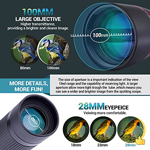 [Speciale per l'osservazione degli uccelli] Ingrandimento 25x-75x, diametro dell'obiettivo di 100 mm e sistema di messa a fuoco dinamica dell'obiettivo, vi mostra un effetto visivo più ampio e più luminoso, appositamente progettato per l'osservazione degli uccelli.