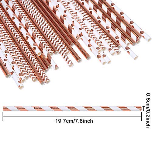 Cannucce di carta color oro rosa, confezione da 150 cannucce biodegradabili in lamina metallica a righe/onda/cuore/stella, per compleanni, matrimoni, Natale, baby shower, feste di compleanno