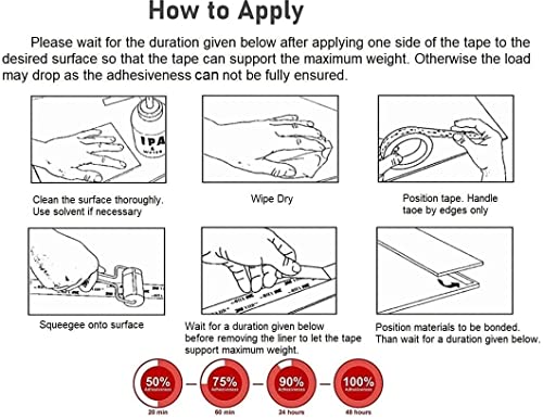 COME SI APPLICA: La superficie deve essere asciutta e pulita. Dopo aver applicato un lato del nastro sulla superficie desiderata, la forza di adesione aumenterà man mano che l'adesivo scorre sulla superficie. Si prega di attendere prima di incollare l'altro lato del nastro per la durata indicata di seguito. TEMPO DI ATTESA: A temperatura ambiente si raggiunge il 50% della resistenza finale dopo 20 minuti, il 75% dopo 60 minuti, il 90% dopo 24 ore e il 100% dopo 72 ore.