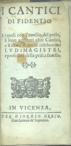 I CANTICI DI FIDENTIO. A i quali con l'auxilio del prelo, si sono aggiunti altri Cantici, e Rithmi di molti celeberrimi Ludimagistri, e professori della prisca favella