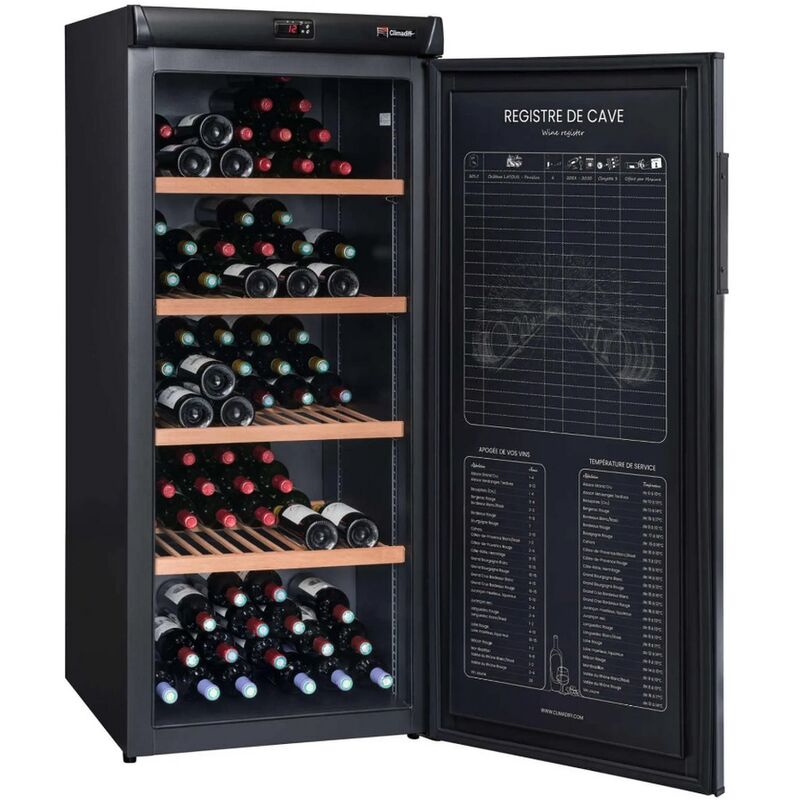 RISERVA185 cantina di invecchiamento DA Climadiff. Igrometria regolata: naturale (principio dell'igrodinamica). Tecnologia unica che consente un flusso d'aria naturale e ottimizza l'uso del filtro a carbone. Serbatoio in metallo per un migliore rendimento dell'umidità interna della cantina. Regolazione elettronica. Termometro elettronico con display rosso. Visualizzazione della temperatura interna su schermo LED rosso. Compatibile con Vinotag: applicazione gratuita per la gestione delle cantine. Accedi ad una rappresentazione digitale della tua cantina e ad un registro dettagliato dei suoi contenuti. Sicurezza dal freddo estremo: ti permette di mantenere una temperatura positiva nella tua cantina e impedisce il congelamento delle bottiglie in inverno. Sistema antivibrante. Tipologia di prodotto: Cantina. Tipologia di cantina: Invecchiamento. Tipo di installazione: Installazione gratuita. Etichetta energetica 2021: G. Numero di bottiglie: 180. Capacità: 180 bottiglie. Consumo elettrico