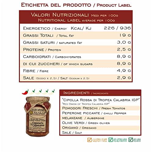 ✅ INGREDIENTI: Cipolla Rossa di Tropea Calabria IGP, melanzane di Calabria, pomodori freschi, peperoni piccanti, olive verdi, olio di oliva, sale, origano.