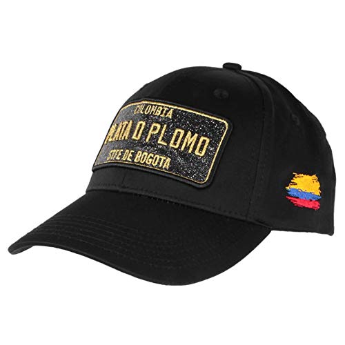 Acquista un cappello Plata o Plomo nero in tela di cotone premium con bandiera colombiana, cappello Colombia uomo e donna in una grafica elegante e chic del marchio SKR, patch Plata o Plomo dorato 3D con strass brillanti, visiera baseball fashion, taglia regolabile.