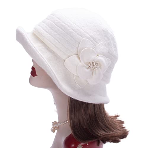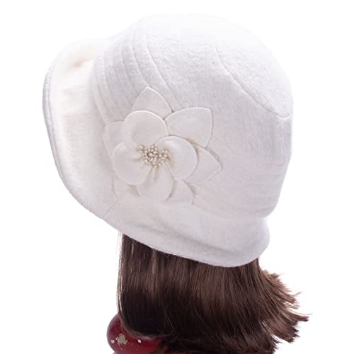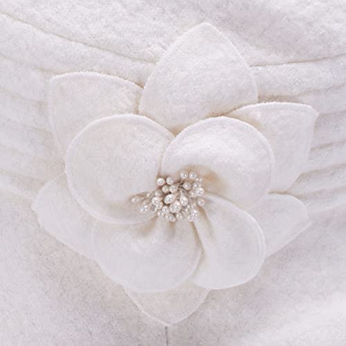 Cappello cloche invernale da donna, elegante, classico, in morbida lana, con fiore, A299 Ivory Taglia unica